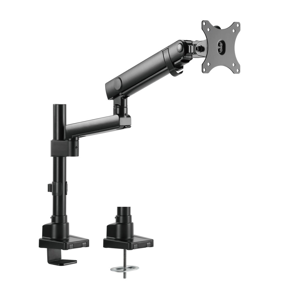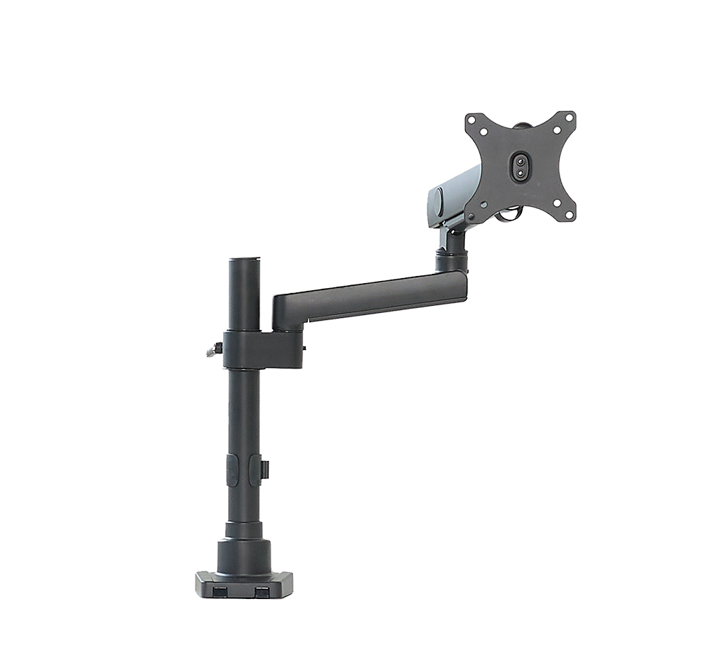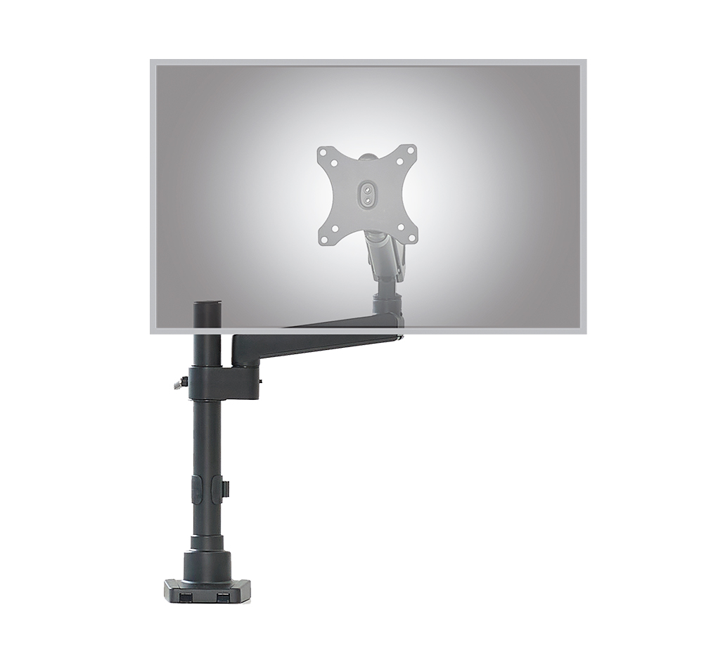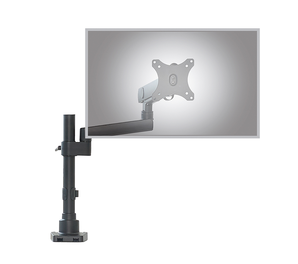 - Spring articulated pole mounted arm “floats” monitor above desktop