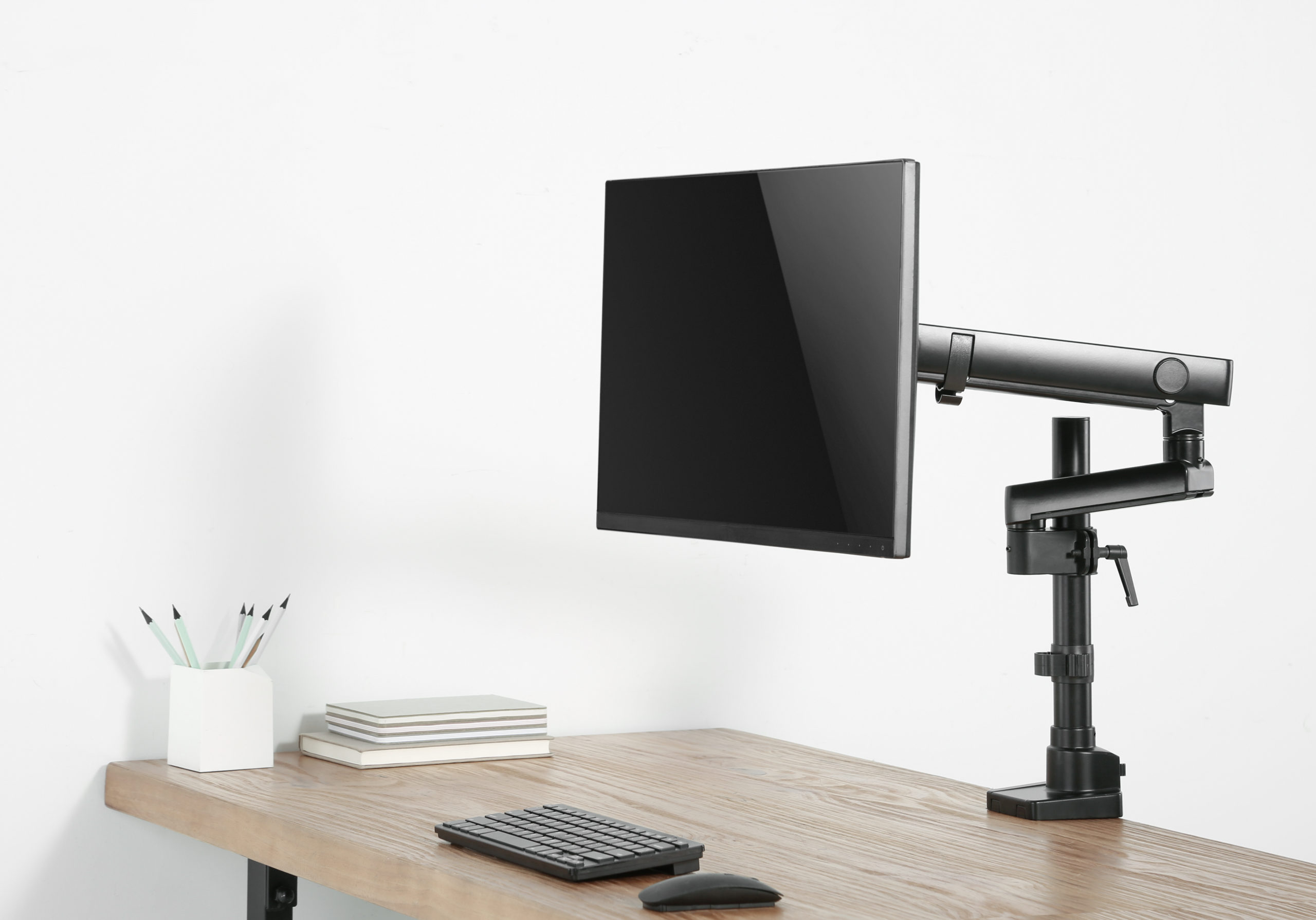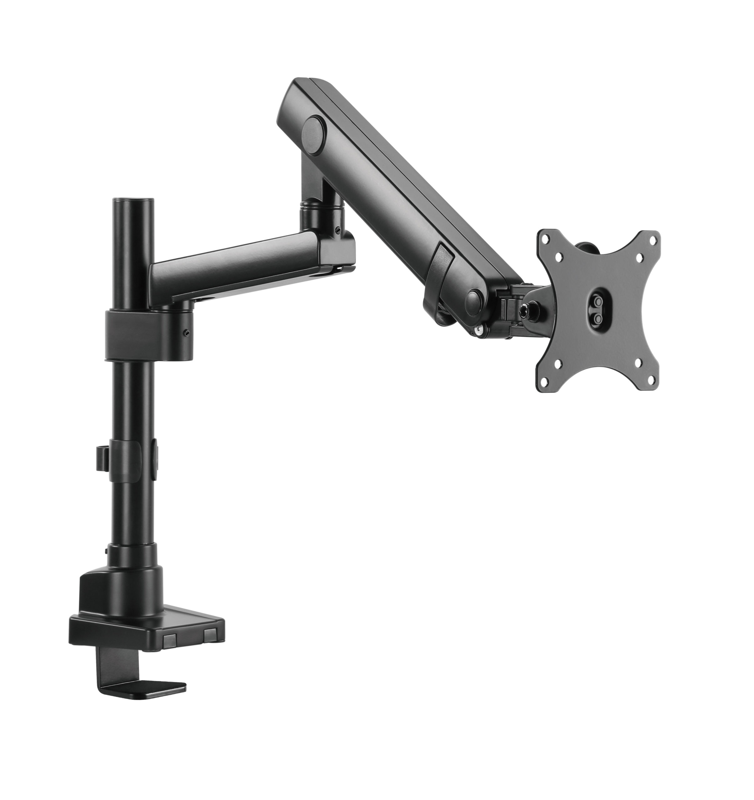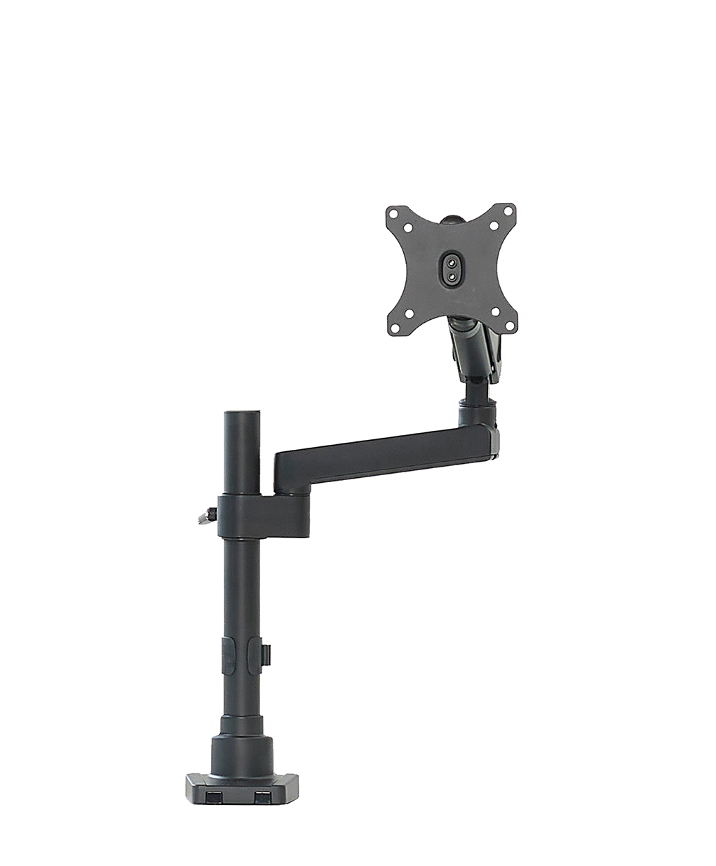 - Spring articulated pole mounted arm “floats” monitor above desktop