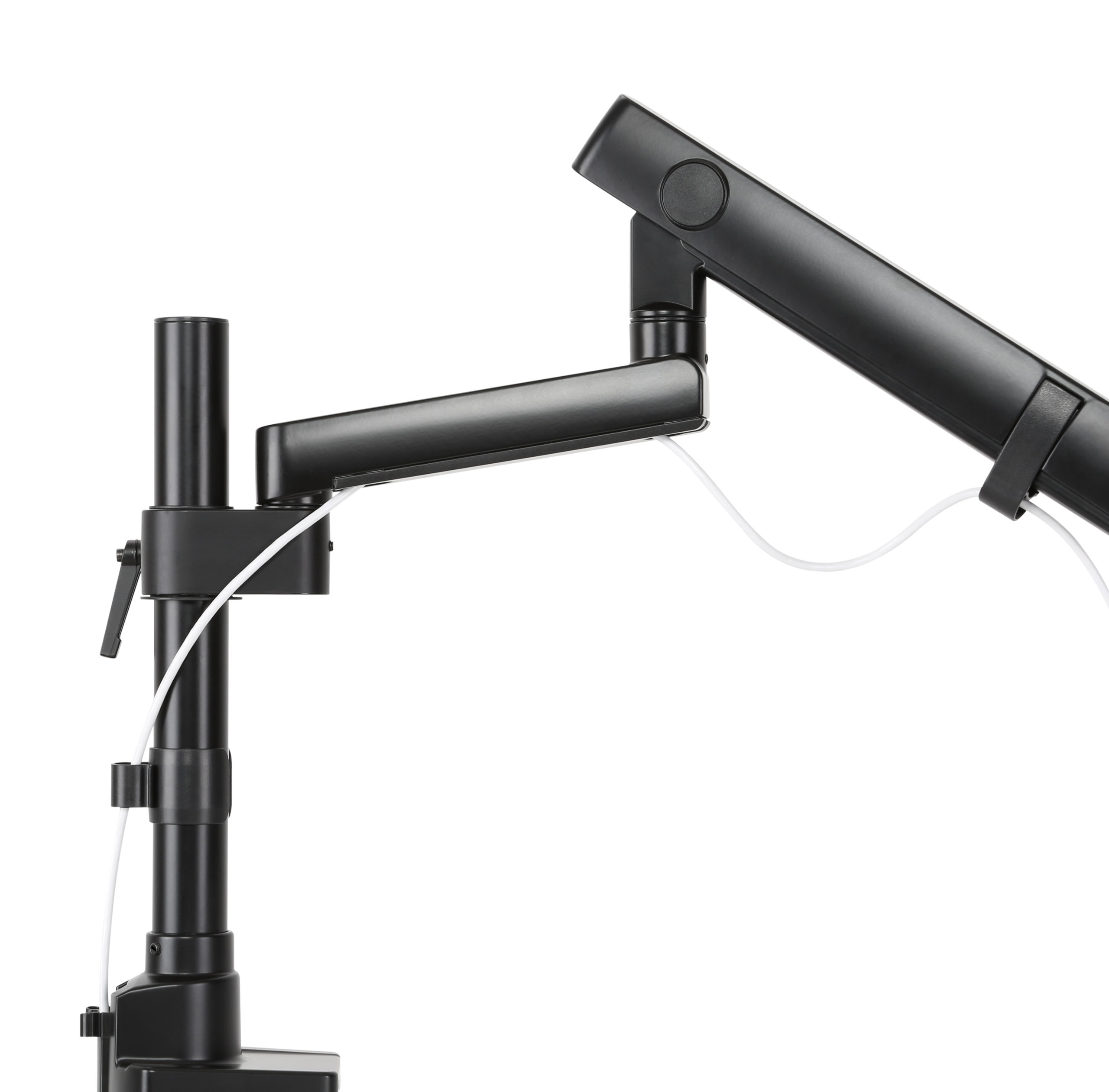 Actiflex II single dynamic monitor arm and mount is easily adjustable, at the touch of a fingertip. The integrated spring mechanism allows for precise and stable monitor positioning; the dynamic arm being counter-balanced by the weight of the monitor. The monitor itself can be tilted up to 180 degrees, and pivoted from landscape to portrait. Integrated cable management within the arm segments and cable clips to the pole keep the work surface free from cable clutter.