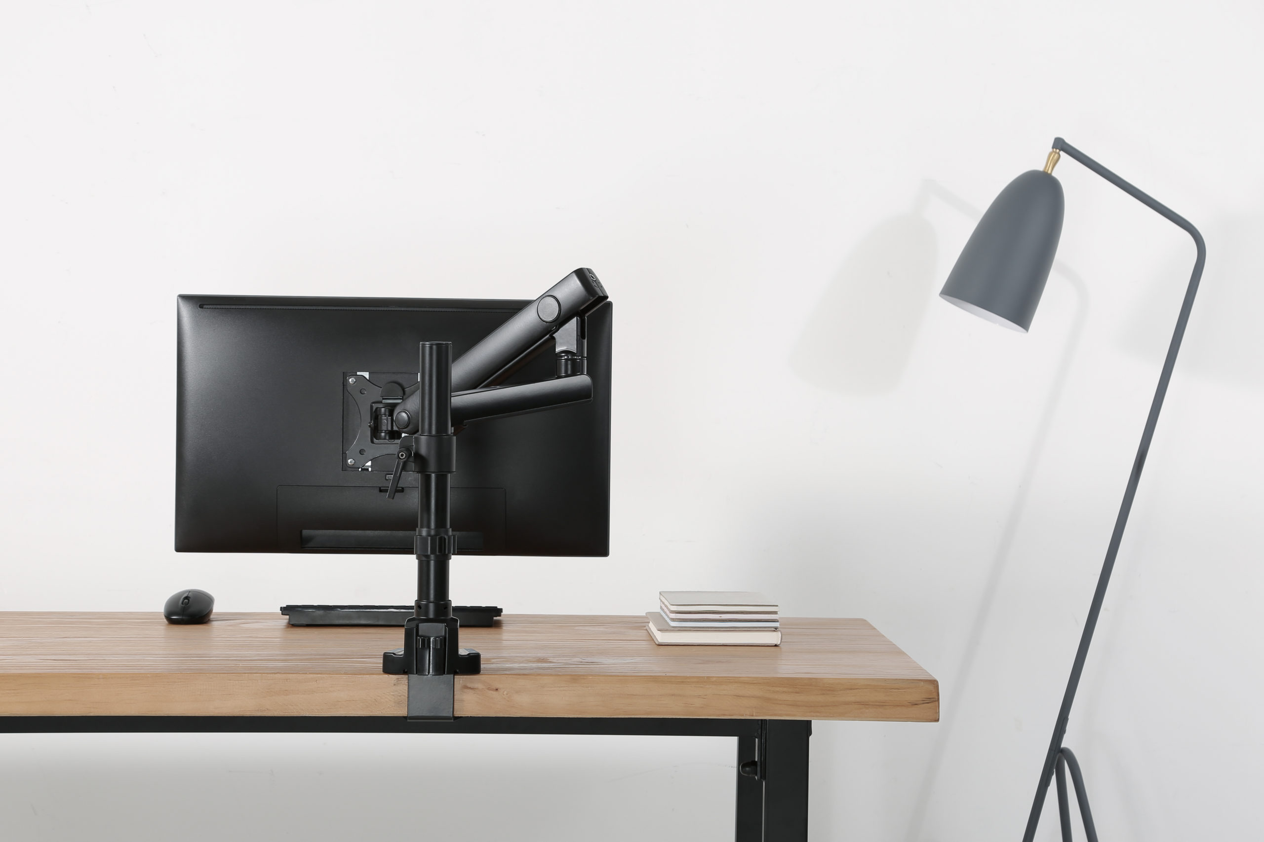 - Desk-clamp or through-mount included