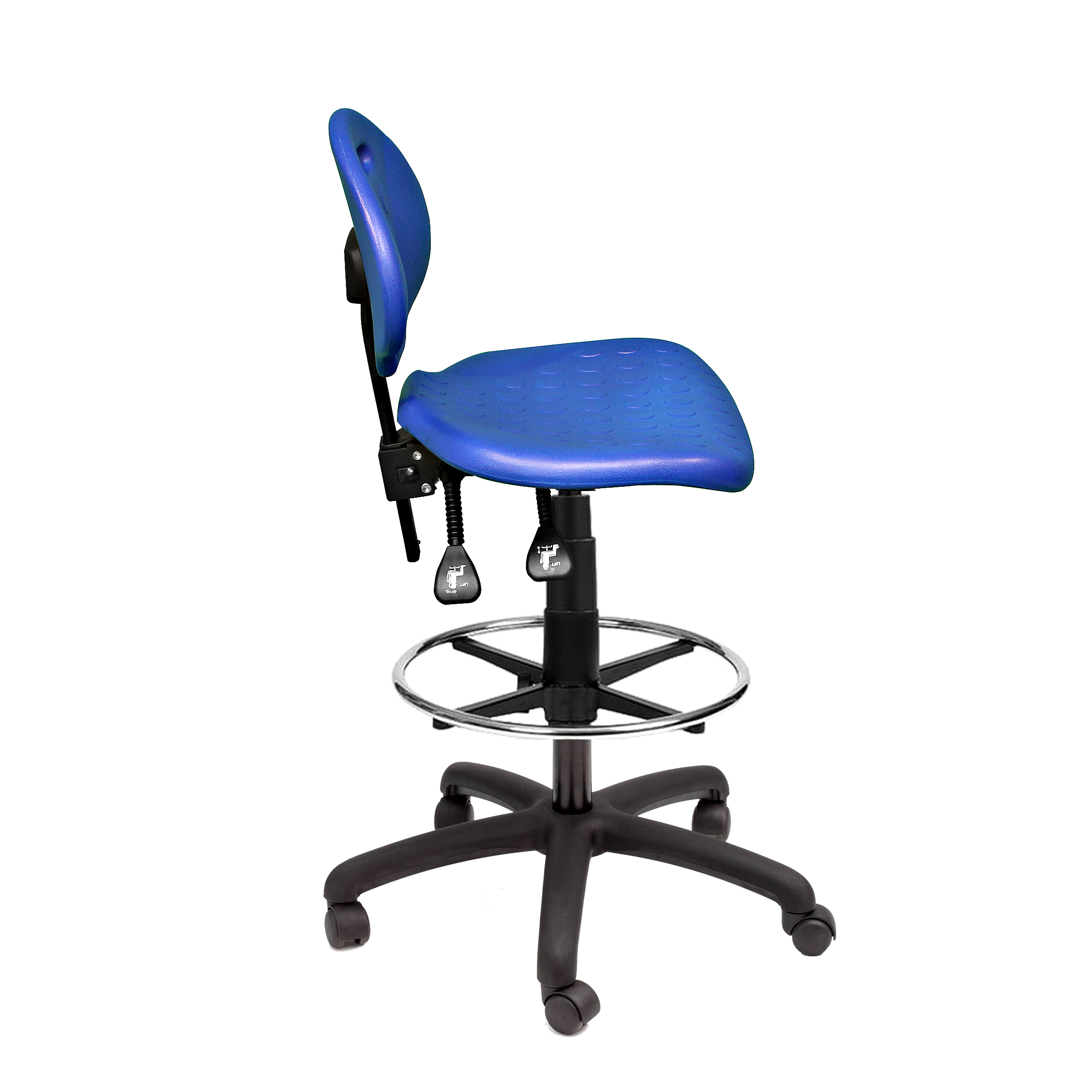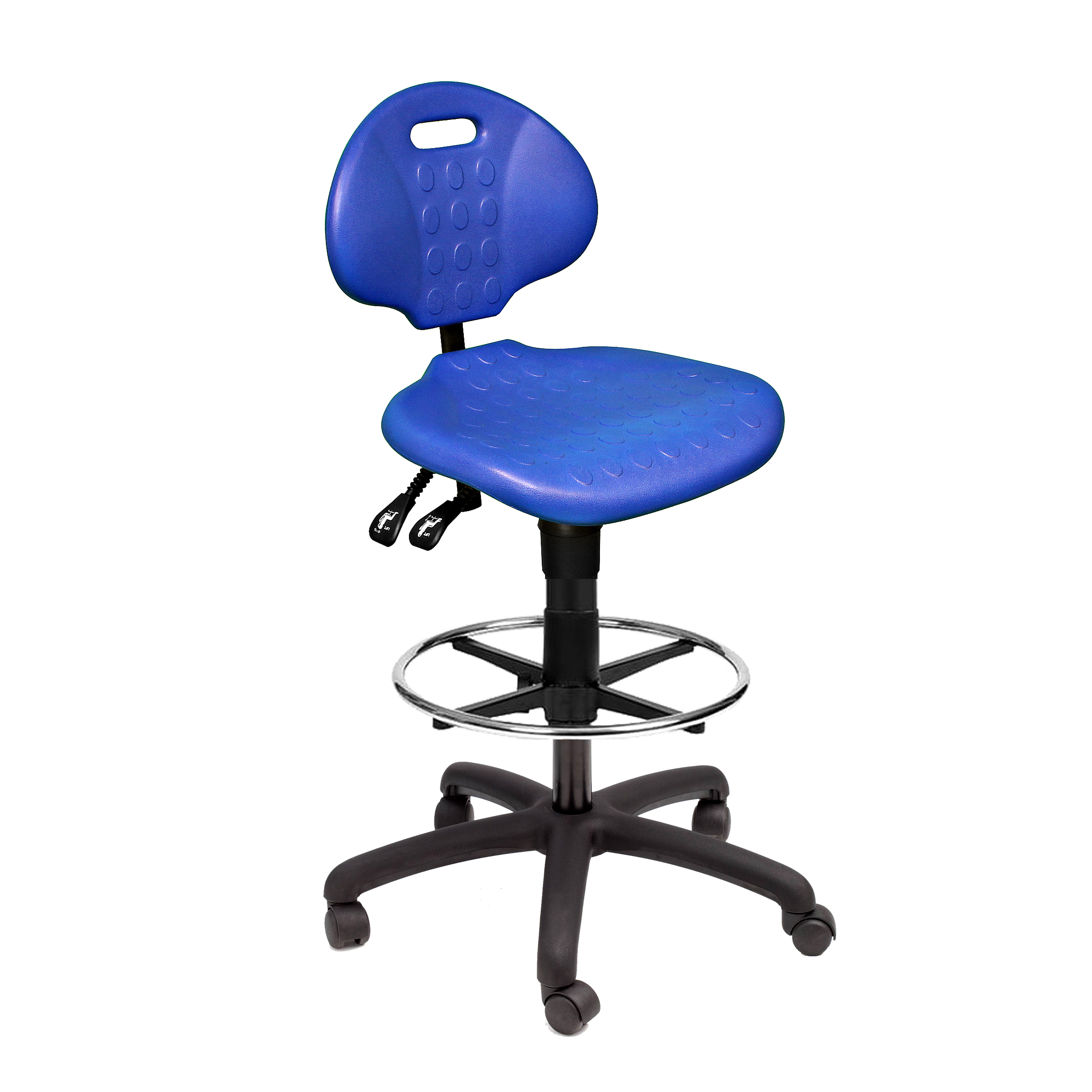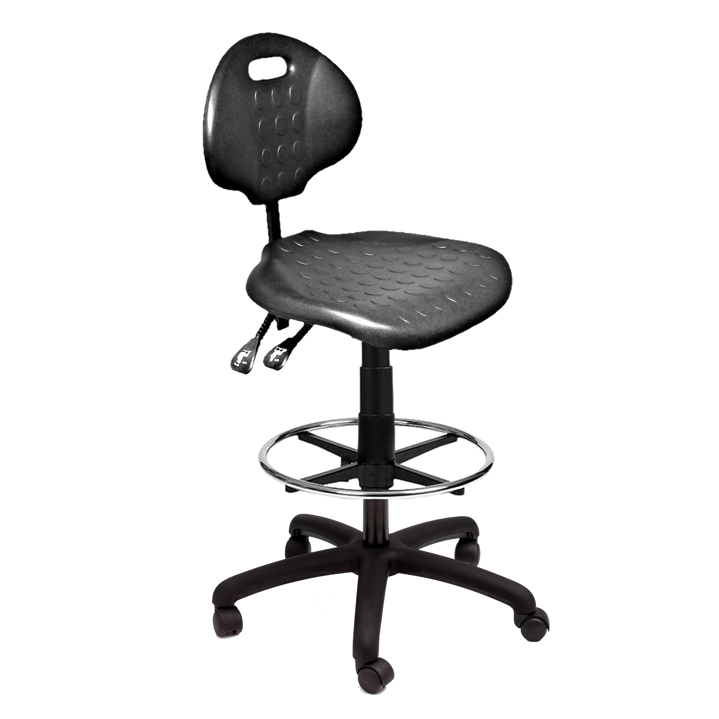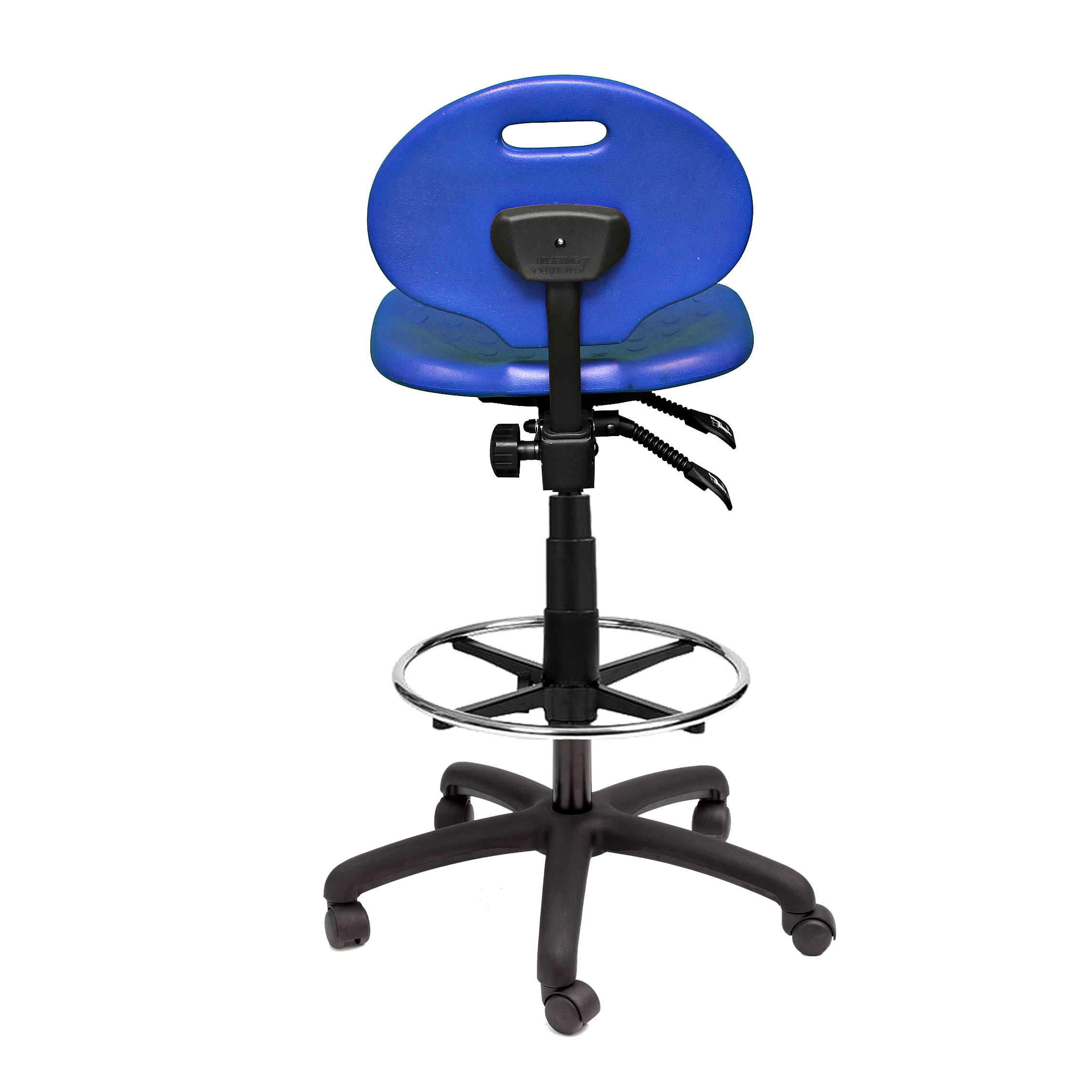 Designed for PC1 and PC2 (PC = Physical Containment of micro-organisms) compliance, the Clam Round drafting chair features a tough skinned polyurethane seat-pan and backrest. The polyurethane is moulded over an internal steel frame, with an integral carry handle built into the back-rest. The quad fastened back-rest stem gives extra strength. Manufactured without adornment, and configured with sturdy components, the Clam Round drafting is a rugged, stain resistant chair, impermeable to water. With its high rise gas lift and foot-ring, the Clam Round Drafting is suitable for bench (typically 900 mm high) use. A popular choice in University labs, the Clam is also ideal for home workshops.