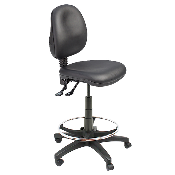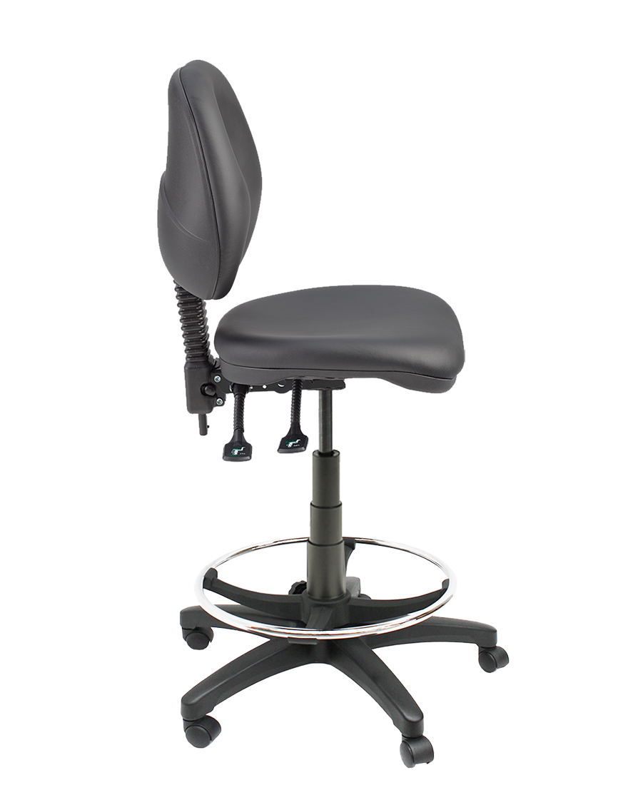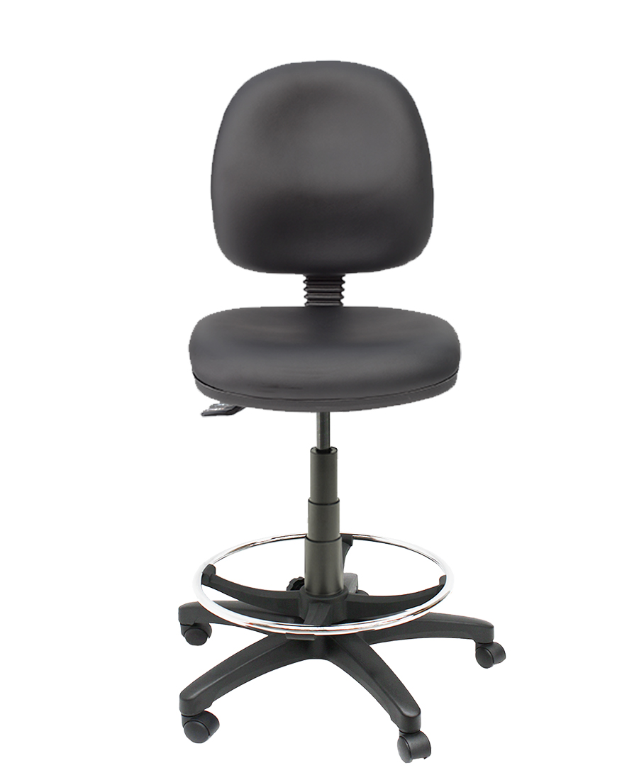 Upholstered in Australian in a tough black vinyl over contoured foam, the Gala Lab Drafting Chair is a comfortable alternative to polyurethane drafting chairs. The moulded back-rest features enhanced lumbar support, and the ergonomic design of the Gala Lab Drafting Chair makes it easy to adjust for seat height, backrest height and back-rest angle. The Gala Lab Drafting Chair also features an enclosed seat pan to keep cleaning simple. The chair is fitted with an inverted telescopic gas-lift cover to prevent dust from affecting the smooth operation of the gas lift and a 700mm black nylon star base for more stability.