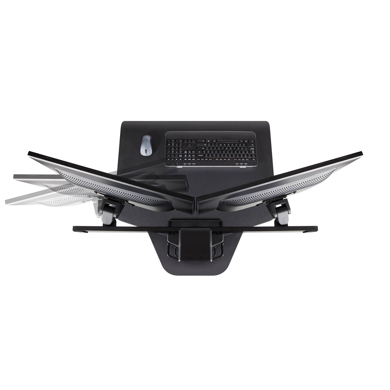 Designed to accommodate standing work without the distraction of unwanted movement. Expansive workspace. Large surface and convenient storage tray allow you to bring all necessities with you when you stand. Upgrade your space. Retrofit your existing desk into a healthy workspace with the freestanding base. Seamless height adjustment. Features a 17″ (43.18cm) range of vertical height adjustment and a locking cylinder to keep the workstation in place. No manual adjustment needed.